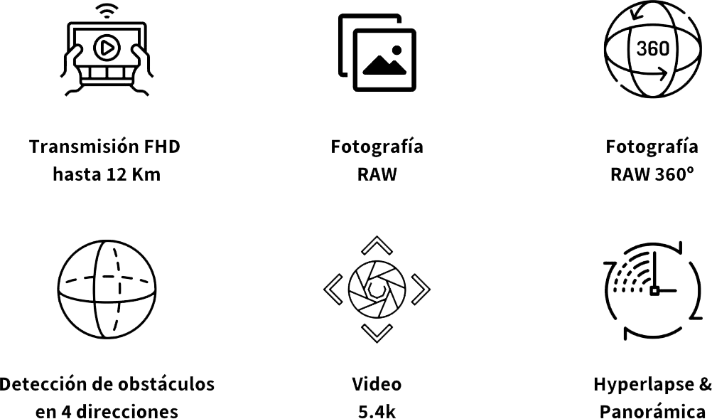 Permite producir contenido aéreo en formato de Video, Fotografías, Hyperlapse, Timelapse y Fotografías 360º.